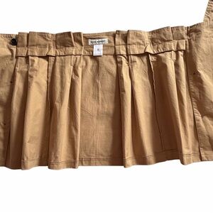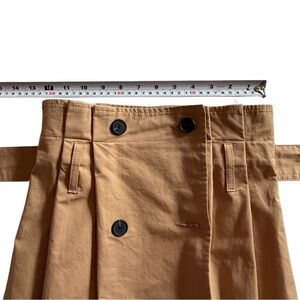 Reminiscent of British Luxury, this structured high-waist trench mini skirt is current yet classic. Button-front, tailored pleats with a self-tie belt creates this polished look. Versatile neutral tone for easy styling.