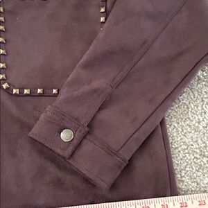 The soft velvety suede-like fabric gives the jacket a luxurious feel while the stud accents add the perfect touch of attitude and personality.