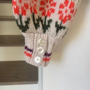 This knit sweater from Free People is featured in a cozy wool blend with a dramatic collar, button details, ribbed cuffs, drop shoulders, and long balloon sleeves.
