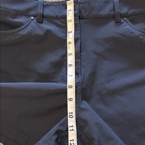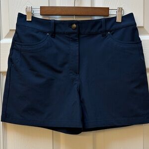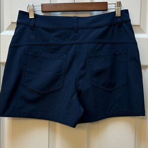 Navy blue lululemon athletica women's shorts featuring a high-rise fit and classic five pocket layout. Smooth, stretch fabric for movement. Belt loops and clean stitching. Simple athletic silhouette for daily wear. Like new condition! Measurements laid flat: