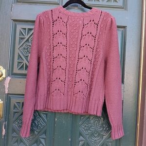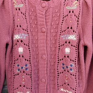 Dark mauve pink knit cardigan with embroidered floral motifs. Button-front closure and textured knit panels. Openwork lace detailing along the front. Feminine, versatile layering piece. Made from 60% cotton, 40% recycled polyester. Machine wash cold, dry flat.