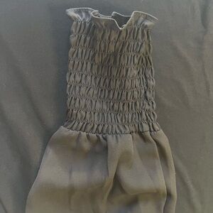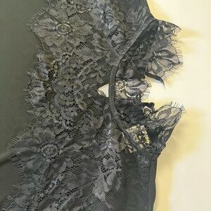 Elegant black blouse with lace detailing. Features sheer lace sleeves and a high neckline. Perfect for a sophisticated look.