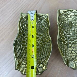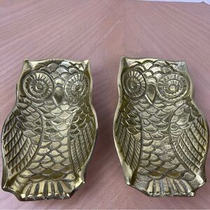 Pair of owl-shaped brass trinket dishes. Decorative embossed feather and eye details. Great for jewelry, keys, or accents. Elegant gold-tone finish.