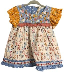 Keywords: Matilda Jane dress, girls smocked dress, alphabet print, floral embroidery, ruffle sleeves, childrens clothing, boutique dress, playful style, birthday outfit, spring dress, summer dress, unique print