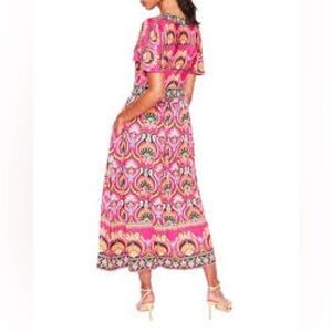 Vibrant pink maxi dress with intricate green patterns. Features a V-neck and short sleeves. Perfect for a stylish look.