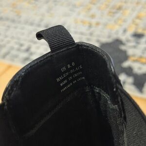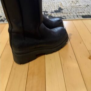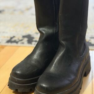 Stylish black calf high boots with a chunky platform sole. Smooth leather upper for a sleek look. Easy to pair with casual or dressed-up outfits. Comfortable block platform for all-day wear.