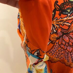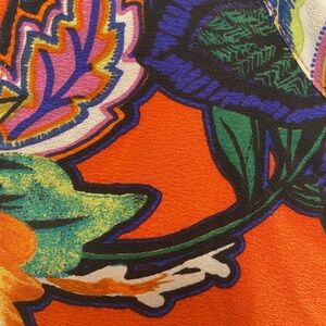 Color: Orange large vibrant flowers * Lined Swing silhouette High neckline * Side pockets * Button back * Sleeveless * Material: 100% silk