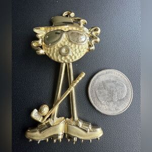 A whimsical articulating lady golfer brooch signed AJC (American Jewelry Company) on back. The brooch is gold tone metal with a straight pin closure & safety catch.