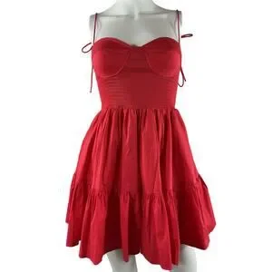 Vibrant hibiscus red mini dress featuring a smocked bodice with seamed cups, adjustable tie spaghetti straps, and a tiered gathered skirt. Made from a cotton blend with a cotton lining.