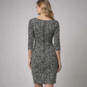 This elegant classic black dress features a striking raised textured pattern in silver and white, creating a subtle yet eye-catching dimension against the classic silhouette. Designed with a timeless round neckline, flattering three-quarter length sleeves, and a sleek back zip closure, it offers a polished look that transitions effortlessly from day to evening. Fully lined and craftsmanship gives the piece a refined, structured feel.