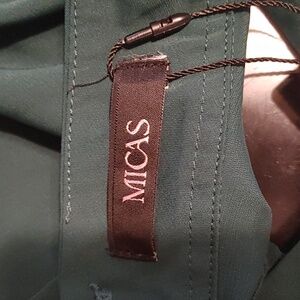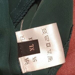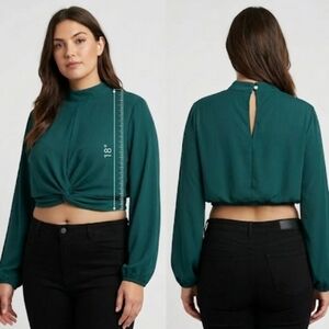 Micas Elegant Emerald Green Long sleeve cropped blouse, high neck that buttons in the back and a stylish twist front. Perfect for night out, event. Pair with pants or skirt for classy chic look. Tag says women's XL, (appears to run small) measurements below.