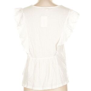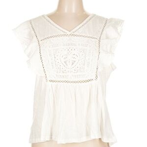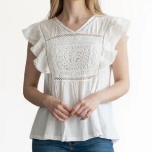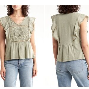 NWT LUCKY BRAND Short Flutter Sleeve Open Stitch Trim Cotton Top Size Large.