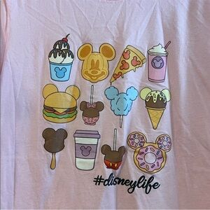 Fun Disney graphic tee with playful icons. Soft pink fabric. Perfect for fans.