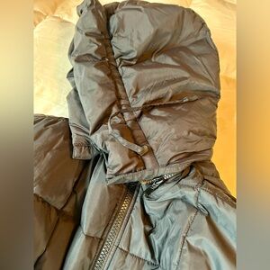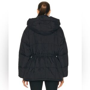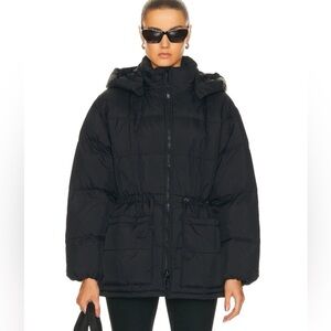 Insulated quilted puffer with a relaxed fit. Hooded design for extra warmth. Front zip closure and drawstring waist. Side pockets for storage. Sleek all-black finish for versatile styling.
