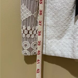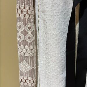 Delicate ivory lace overlay. Floral lace pattern across fabric. Black trim and bow detail at waist. Feminine sheath silhouette. Elegant and refined style.