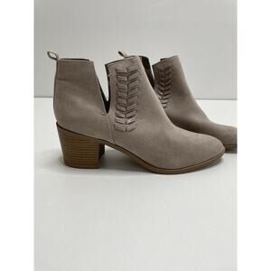 Pull on, almond toe, beige brown booties, cut out at ankles with weave pattern accent, low to medium height square block heel, faux suade material.