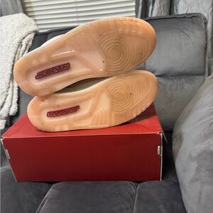 Stylish Jordan sneakers in soft pink leather. Red Jumpman logo on the tongue. Lace-up design with gold-tone eyelet accents. Cushioned collar and supportive sole. Feminine and sporty look.