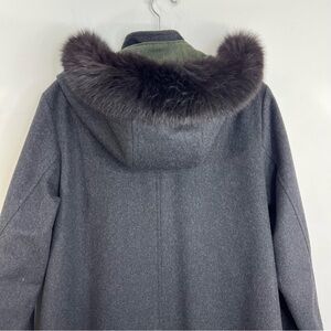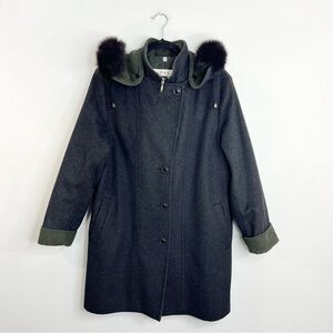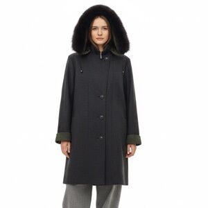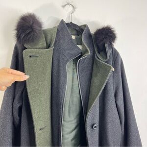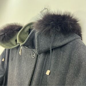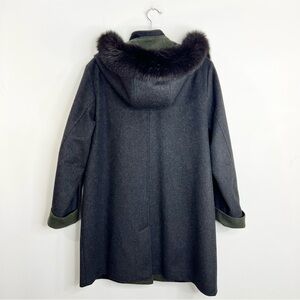 Vtg Italian made grey green wool blend LODEN coat removable fur trim hood EU 38