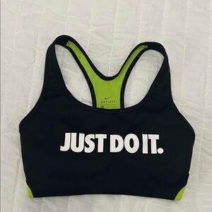 Sleek black sports bra with vibrant green lining. Features bold 'Just Do It' slogan. Ideal for active wear.