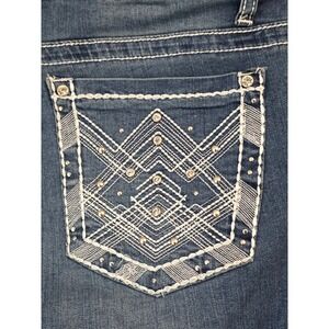 These Earl Jean skinny jeans offer a flattering fit with a blend of cotton, modal, polyester, and spandex for comfortable stretch. The medium wash denim is highlighted by striking contrast stitching and elaborate embroidery on the back pockets, featuring geometric patterns accented with sparkling rhinestones and metallic studs. A classic five-pocket design and branded hardware complete this stylish pair. These jeans are in excellent used condition.