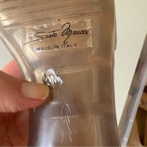 Sleek silver slide sandals by Sesto Meucci. Square multicolor gem embellishments across the strap. Slip-on design with cushioned footbed. Adds a pop of color to any outfit.