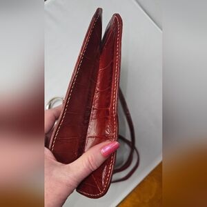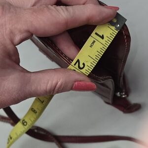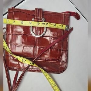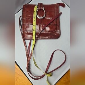 Croc-embossed leather crossbody in rich wine. Silver ring hardware accent on front. Slim adjustable strap for hands-free wear. Classic silhouette for everyday style.