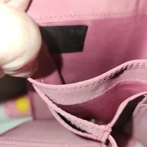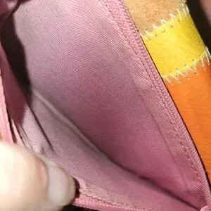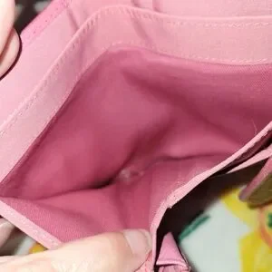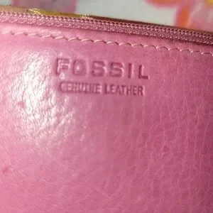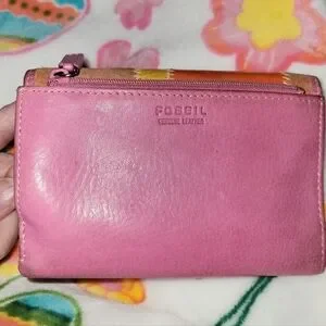 Vintage Fossil Pink Leather Patchwork Front Tri-fold. Gently loved with normal wear. Coin residue in zipper section (see pic) Some Scratches & normal blemishes. But nothing major. See all pics for wear. Inside tag "fossil" has worn off.