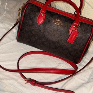 Stylish Coach shoulder bag in rich brown leather. Features elegant gold hardware. Perfect for everyday use.