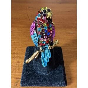 colorful bird ring, macaw ring, parrot statement ring, gold tone bird ring, tropical jewelry, enamel bird ring, stretch statement ring, rhinestone animal jewelry, boho fashion jewelry, quirky statement ring