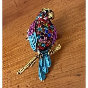 • Crafted in gold-tone metal with colorful enamel wings and brilliant multi-colored rhinestones across the bird’s chest and head, this piece delivers playful vintage charm and standout sparkle.