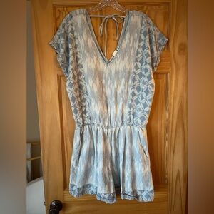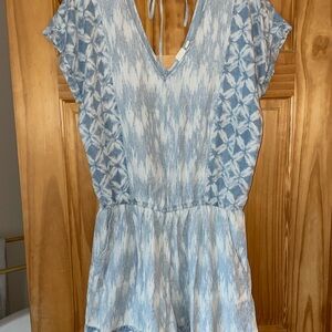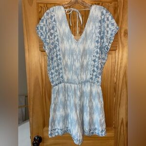 Stylish blue romper with a unique pattern. Features a V-neck and short sleeves. Perfect for casual outings.