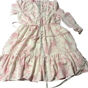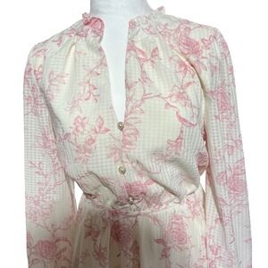 Joie floral mini dress in a delicate pink and cream toile-inspired print over a subtle tonal check pattern. This feminine piece features a ruffled collar with a deep V-neckline accented by three pearl-like buttons. Long sleeves with elasticized cuffs complement the elastic waist and matching tie belt, while a tiered ruffle hem adds movement to the skirt. Fully lined for comfort and coverage.