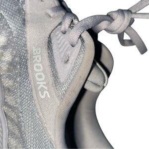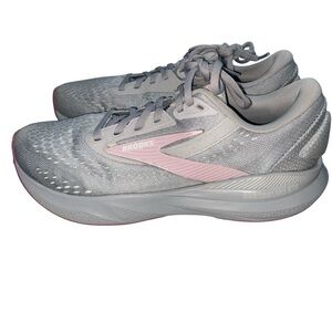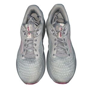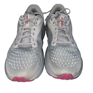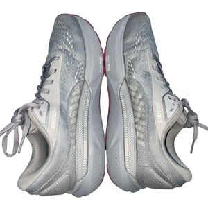 Stylish Brooks sneakers in gray with pink accents. Ideal for running and casual outings. Lightweight and comfortable.