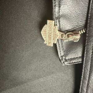 Genuine Harley-Davidson leather motorcycle jacket. Multiple zip pockets and snap closures. Quilted interior for added warmth. Orange and white bar-and-shield logo on front. Heavy-duty hardware and belt detail.
