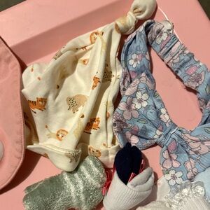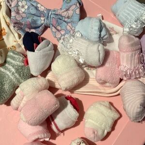 Adorable set of baby accessories featuring beanies, headbands, and socks in pink, blue, and white. Perfect for adding a cute touch to any outfit.