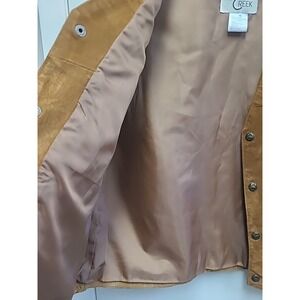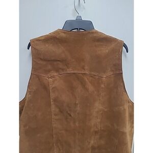 This vest is in excellent condition. Has natural suede line in the back area. It's more of a Camel Brown. See photos and measurements before purchasing.