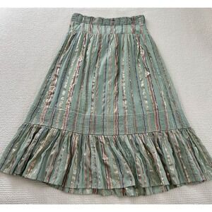 This Anthropologie Audriana Shimmer Maxi Skirt in size XL features a hippie and cowgirl style with a multicolor design, perfect for parties, casual wear, or adding a bohemian touch to any outfit. Made of viscose and cotton, the skirt has a pull-on closure and is accented with layers for added flair. The long skirt is lined, stretchy, and suitable for all seasons, making it a versatile and stylish addition to any wardrobe. With a shimmering finish, this maxi skirt captures a blend of hippie, country, and music-inspired themes.