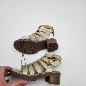 Keywords: gladiator sandals, block heel, girls footwear, metallic gold, buckle closure, lug sole, flexible outsole, non-marking sole, summer shoes, fashion sandals, party shoes, dressy sandals, school shoes