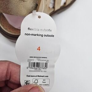 Wonder Nation girls gold gladiator block heel sandals size 4. These stylish sandals feature a secure buckle closure for a custom fit and a durable lug sole for traction. The flexible outsole and non-marking sole provide comfort and practicality for active wear. The metallic gold finish adds a touch of sparkle to any outfit.