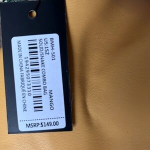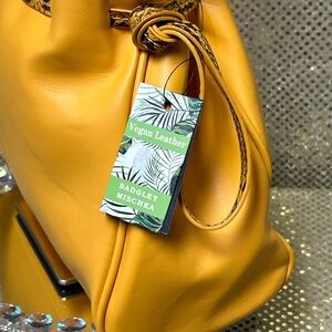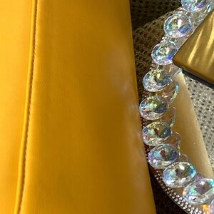 Stylish yellow shoulder bag. Features snake-patterned handles. Elegant design by Badgley Mischka. The interior has a zipper pocket. The lining is tan cloth. The interior lining is yellow sateen with 2 slip pockets and 1 zipper pocket. Crossbody strap is pictured. This bag is new in the package.