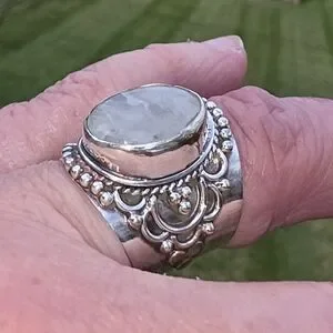 Beautiful glimmery moonstone set in an elaborate Boho style setting