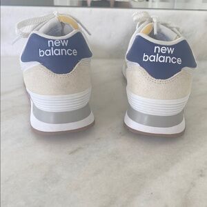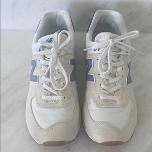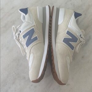 Classic New Balance silhouette. Cream upper with light blue accents. Lace-up closure for a secure fit. Cushioned midsole for comfort. Rubber gum outsole for traction.