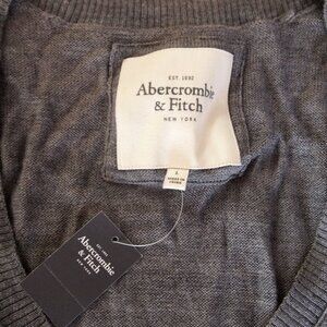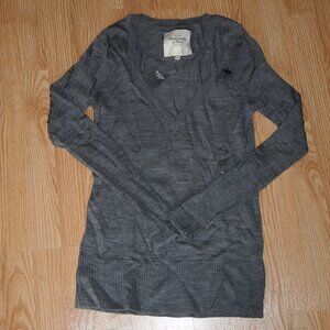 Abercrombie & Fitch Women's Varsity light weight v-neck sweater, size Large. Sweater is gray and features the signature Abercrombie moose embroidered on the chest in navy. Sweater is 100% wool. This classic, retro, preppy style sweater is versatile enough to be worn for any occasion.