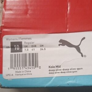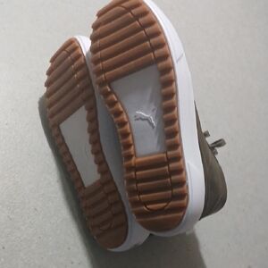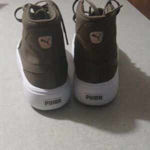 Puma high-top sneakers with lace-up closure. Olive canvas upper for a casual look. Thick white platform midsole adds height. Gum rubber outsole for traction and style.