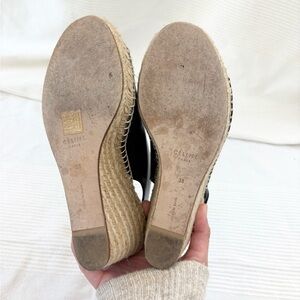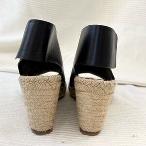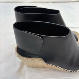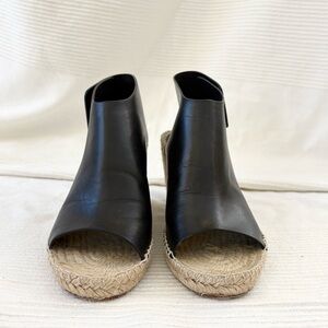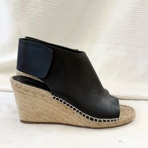 Classic black leather espadrille wedge sandal. Features a smooth leather upper with an open toe and wide ankle strap for a secure fit. Natural jute-wrapped wedge adds height and a casual, versatile look. Valcro closure. Designed for everyday comfort and effortless style. Size 38. Approximately a 7.5-8. In great preloved condition.