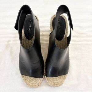 CÉLINE PARIS Black Leather Jute Espadrille Open Toe Heel Wedges EU 38