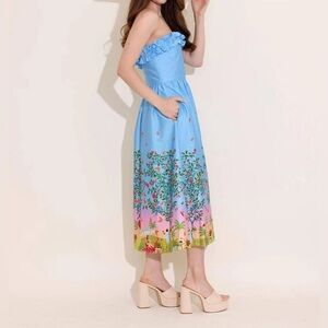 Introducing the Catherine Dress by Alden Adair in Promenade, a charming strapless option for any occasion. This midi-length dress features a fit-and-flare silhouette with a ruffle bodice detail made