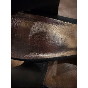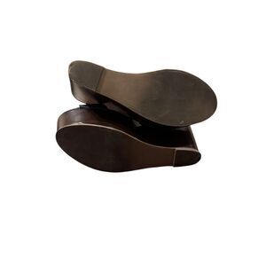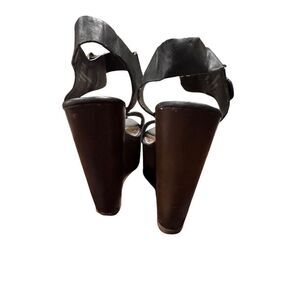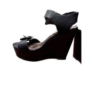 Black faux strappy sandals with brown platform.