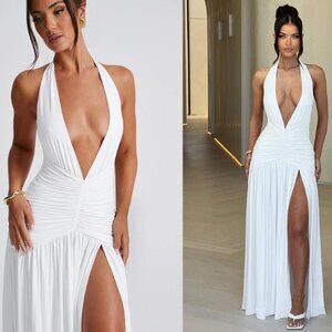 The floor-skimming silhouette is cut & drapes with the natural curves of the body featuring a chiffon V-neck trim