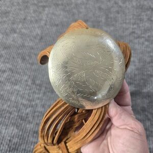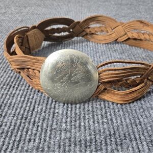 Handcrafted braided tan leather belt with an engraved silver concho accent. Stylish and versatile design pairs well with dresses and jeans. Comfortable woven construction for a secure fit. Tan color adds warm, neutral style to any outfit.